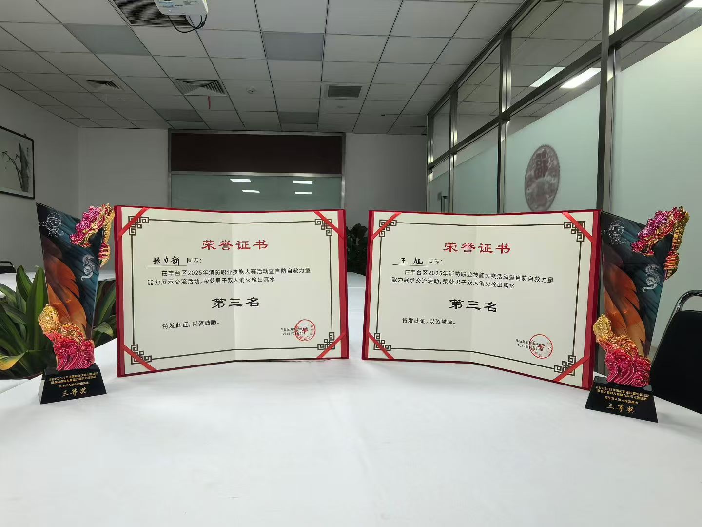 近日,由豐臺區消防救援支隊、區防火安全委員會辦公室及區總工會聯合舉辦的“2025年豐臺區消防職業技能大賽暨自防自救力量能力展示交流活動”順利舉行。公司國投項目員工張立新、王旭兩位同志,代表太平橋街道出戰本次大賽,最終在雙人賽男子組消火栓出真水項目中脫穎而出,榮獲全區第三名的優異成績。